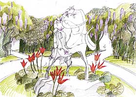 All sorts of interesting vegetation and decorative elements were added to the Palace's formal garden, like this bull statue that the player wil encounter in the very beginning of the game.
