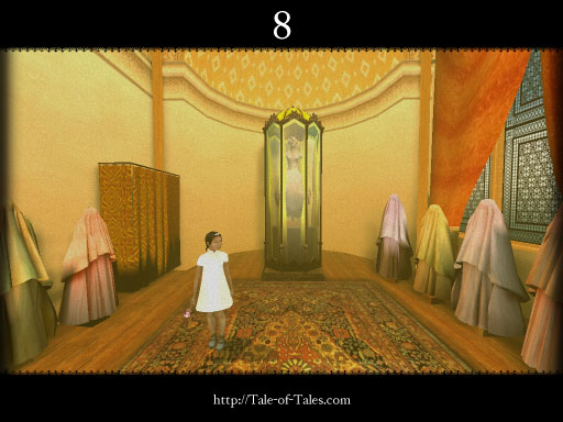 On the Theater Gallery, the Sultan and Sultana are sleeping with torn clothes. If the Girl casts a Telepathy Spell on them, we see a movie from which we understand that they are in this state out of grief for their Daughter who pricked herself while spinning and fell dead. The player needs to have the Girl find fabric and put it in a magical Sewing Machine. Then take the clothes produced by this machine to the Sultan and Sultana. After the new clothes magically appear on them, they have shifted position and the Girl can now take the hand crank that was lying under the Sultana. With this hand crank, she can lower the platform with the Tailor's Mannequin into the Workshop. This mannequin is dressed with a wedding dress made of human hair collected by the Tailor Prince from the sleepers in the palace. The mannequin should have flowers for eyes but is missing one. The Girl needs to find a flower and put it in the eye. When she does that, the mannequin platform starts spinning up by itself and ends up breaking the glass of the display case in the Tailor's Store. This is where the demo ends, providing a cliff hanger that should leave our audience with a desire to see more.
